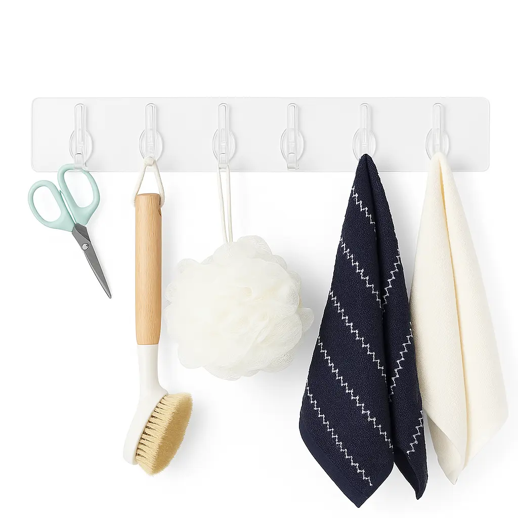Transparent 6-row wall hook with strong self-adhesive backing. Waterproof, durable, and perfect for kitchens and bathrooms.