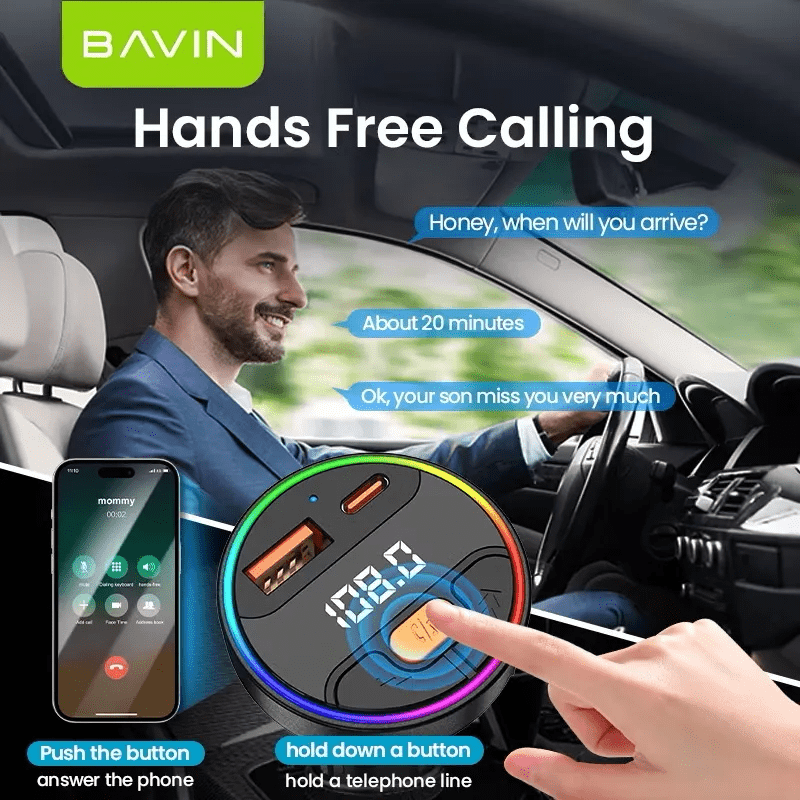 Beyond charging, the BAVIN PC2079 transforms your car’s audio experience. Moreover, equipped with the latest Bluetooth 5.3 chip, it ensures a stable, low-latency connection for streaming music or navigation audio directly to your car’s FM stereo system. It works within a transmission distance of 5 Meters, guaranteeing clarity. In fact, to match the modern aesthetic of your car’s interior, it features 7-color RGB lights. You can switch between colors to create the perfect night-driving atmosphere. Ultimately, this 45W MP3 car charger offers a blend of speed, style, and safety that enhances every journey.