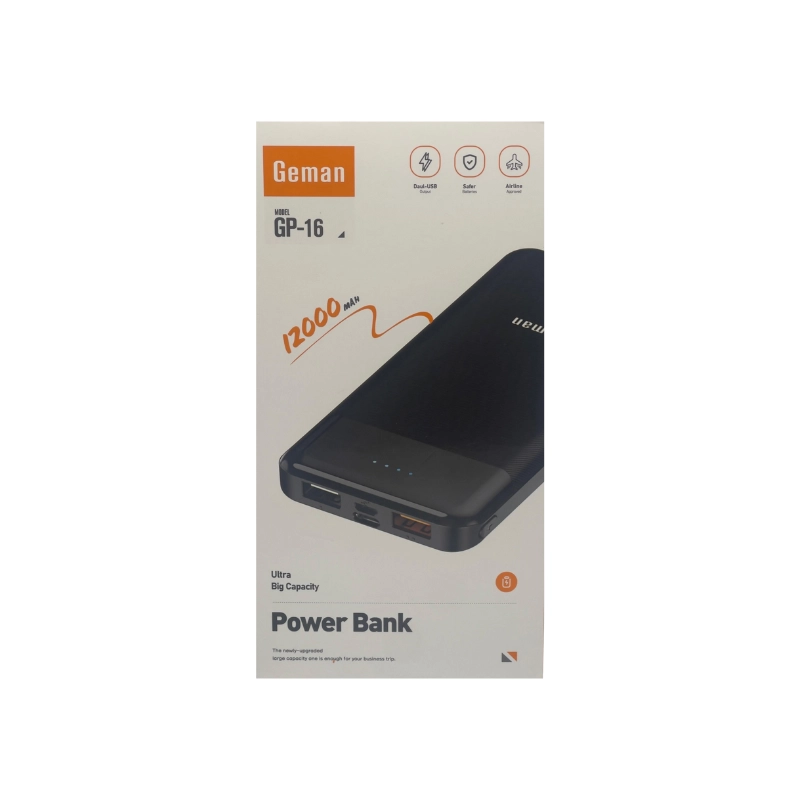 Stay powered throughout the day with the Geman GP-16 PowerBank, a 12000mAh high-performance portable charger designed for multi-device compatibility. Whether you’re charging smartphones, tablets, cameras, GPS units, or MP3/MP4 players, this powerbank delivers stable and efficient output with intelligent chip control.