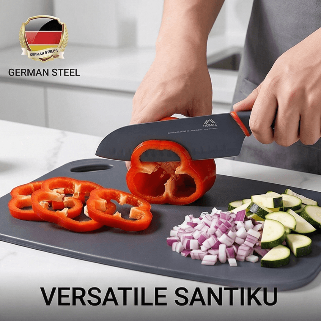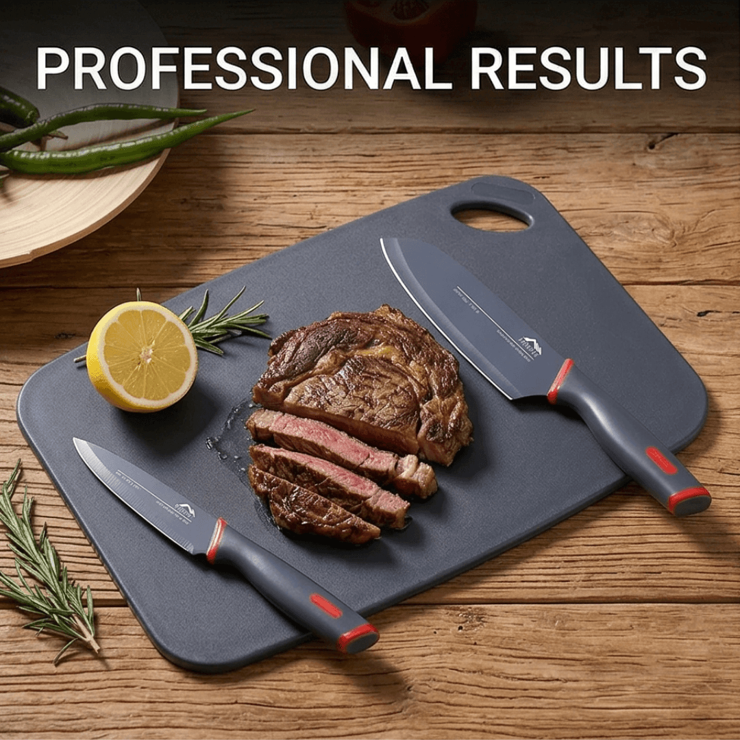 Flimsy plastic boards and weak blades often cause frustrating kitchen accidents. However, this Knife and Cutting Board Set features premium German steel blades. As a result, you get exceptional durability and long-lasting sharpness. Plus, the titanium reinforced coating prevents corrosion completely over time. Thus, you can slice your ingredients smoothly and safely every single time.