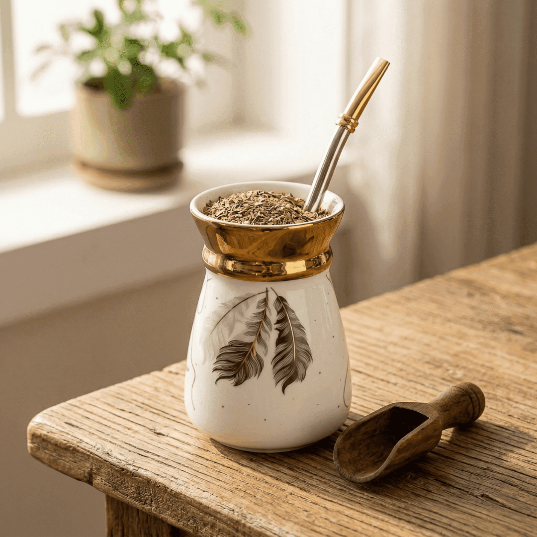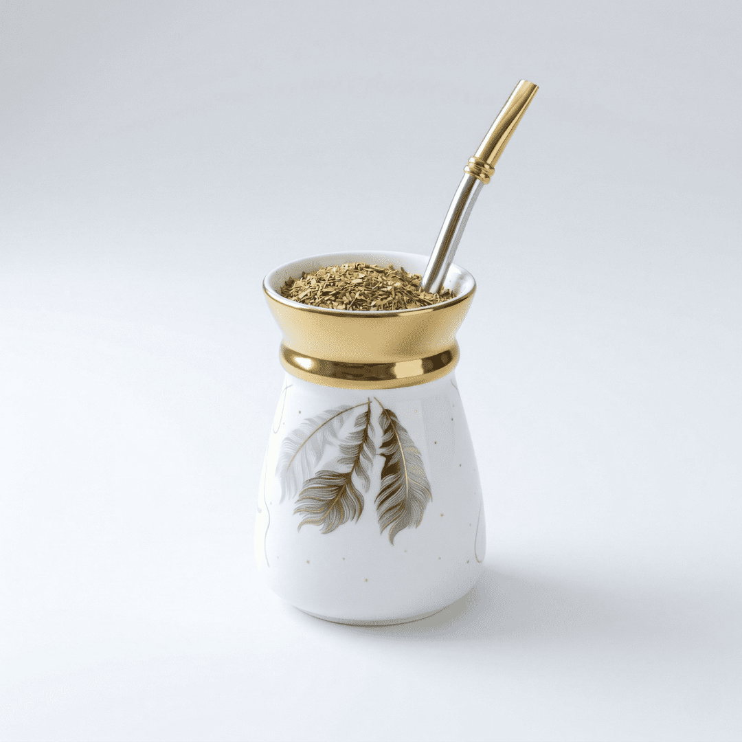 Savor your traditional herbal tea elegantly with the NASMA Series Porcelain Mate Cup. This high-quality vessel features a modern feather pattern and a luxurious gold rim detail for a truly refined look. Additionally, the ergonomic shape provides a comfortable grip for everyday use. Finally, requiring zero curing and offering a beautifully decorative style, this Porcelain Mate Cup is the perfect upgrade for your daily brewing routine.