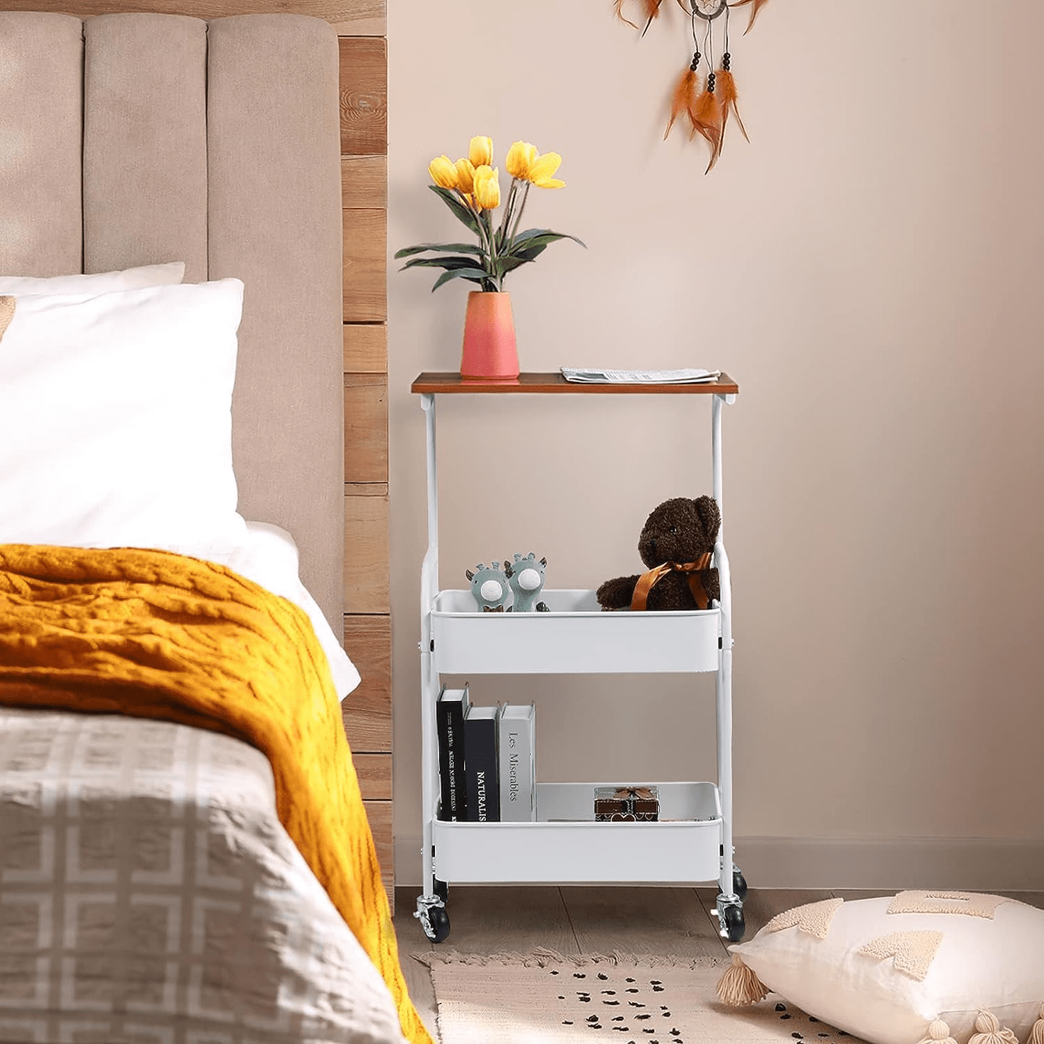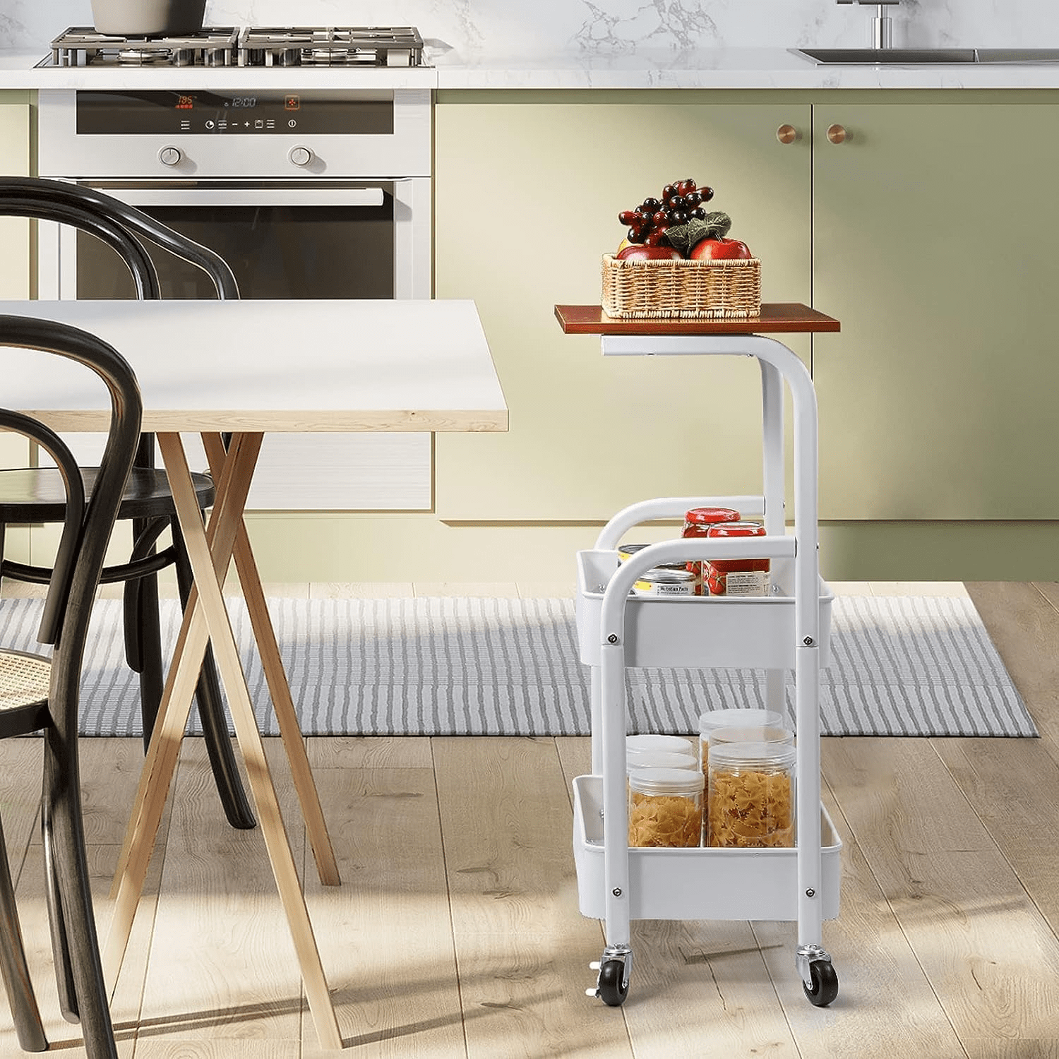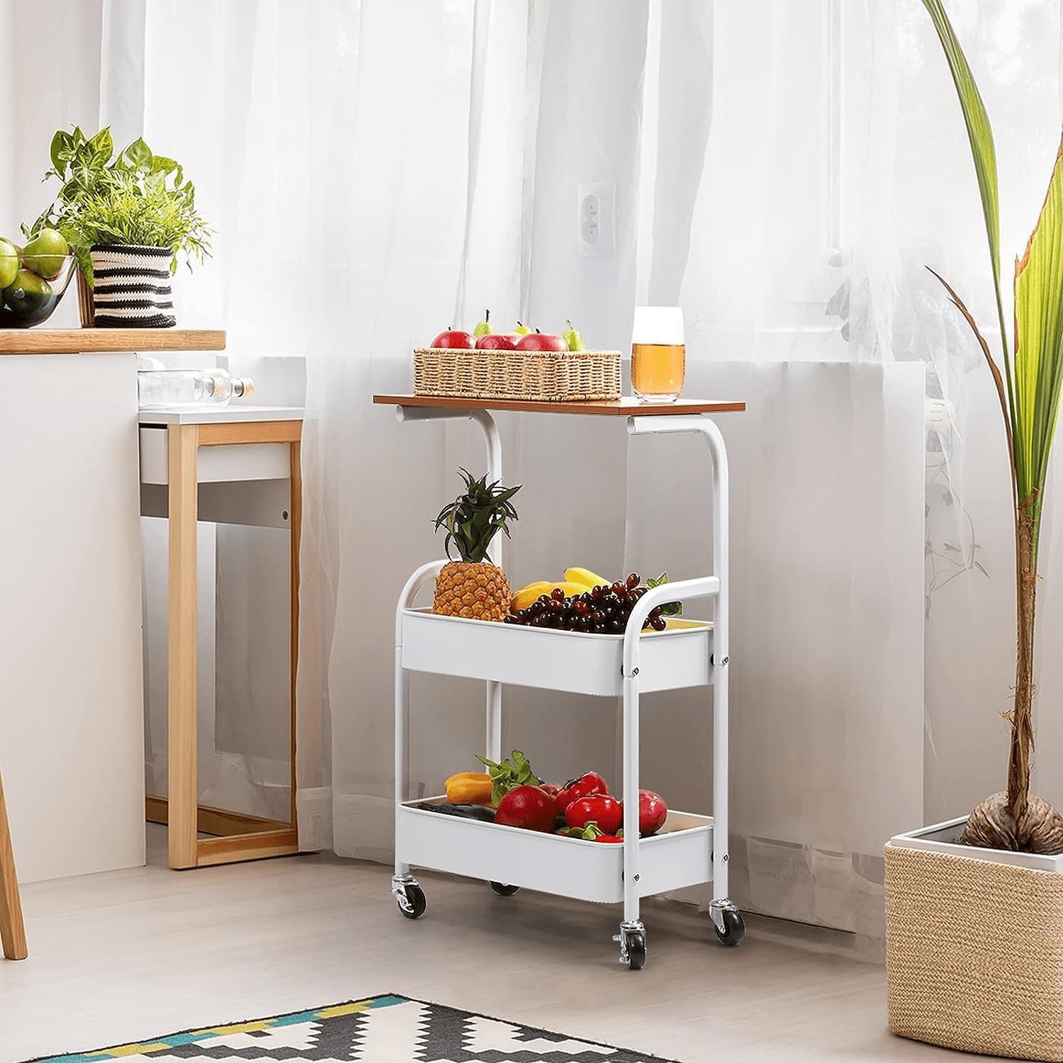3-Tier Storage: Wood top plus two metal baskets.