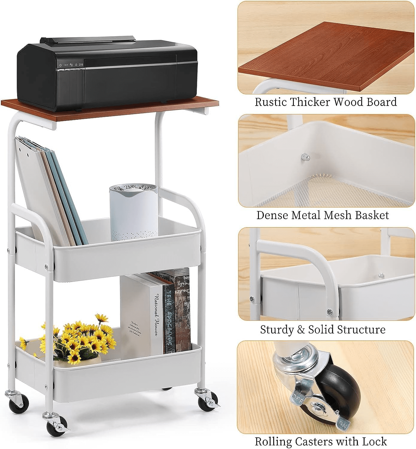 Running out of paper is annoying. Fortunately, this cart offers three levels of storage. The top shelf is made of thick MDF wood, capable of holding your printer or fax machine securely. Additionally, the two lower metal baskets provide ample space for reams of paper, ink cartridges, or books. Consequently, your workstation stays tidy and professional.