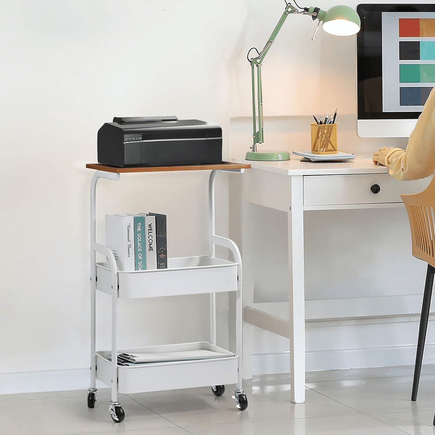 Organize your workspace instantly with the Rolling Printer Stand. Whether you work from home or in a busy corporate office, clutter kills productivity. You need a dedicated spot for your machine and supplies. Because of its smart 3-tier design, this white cart solves that problem efficiently. Therefore, it is the perfect sidekick for your desk, keeping everything within arm’s reach.