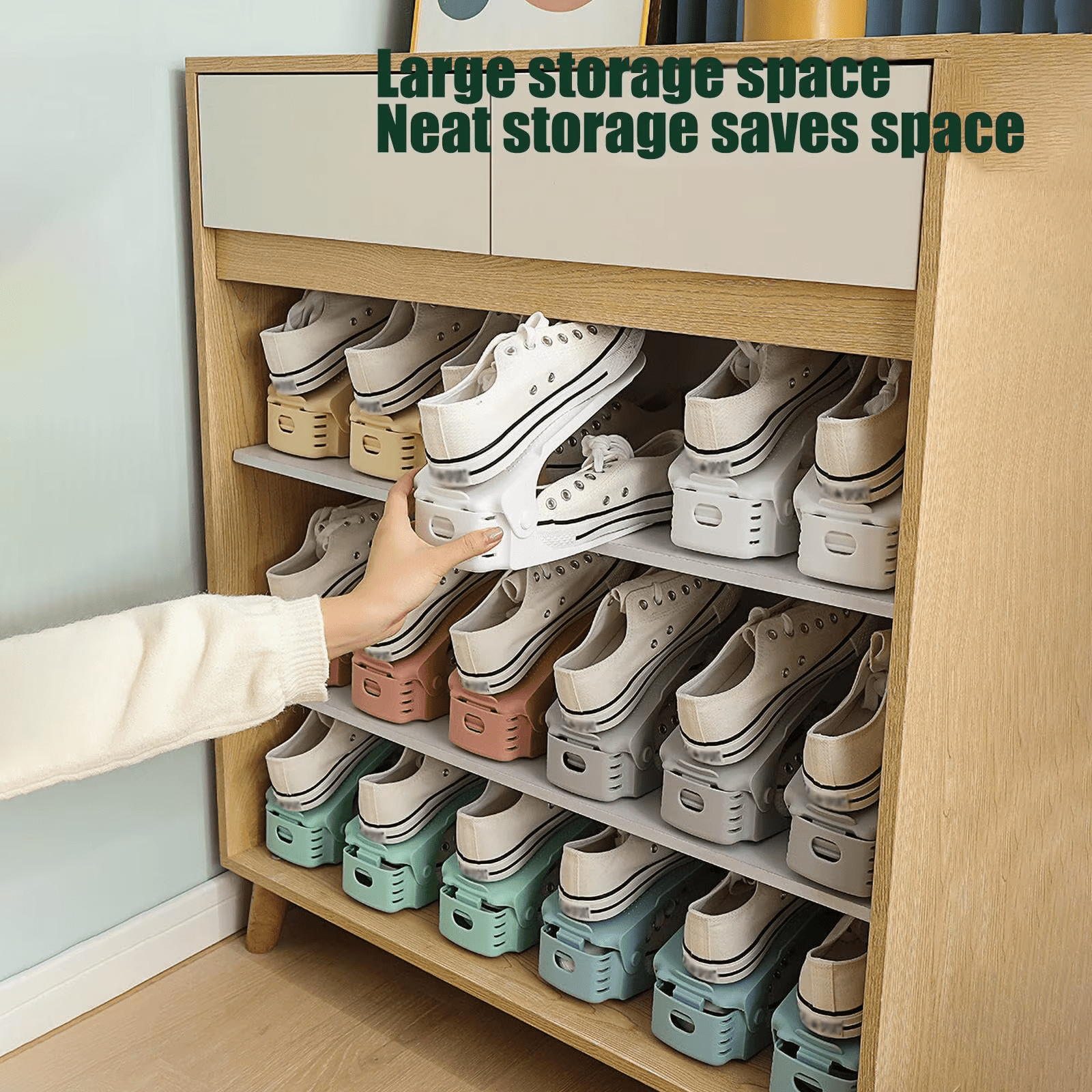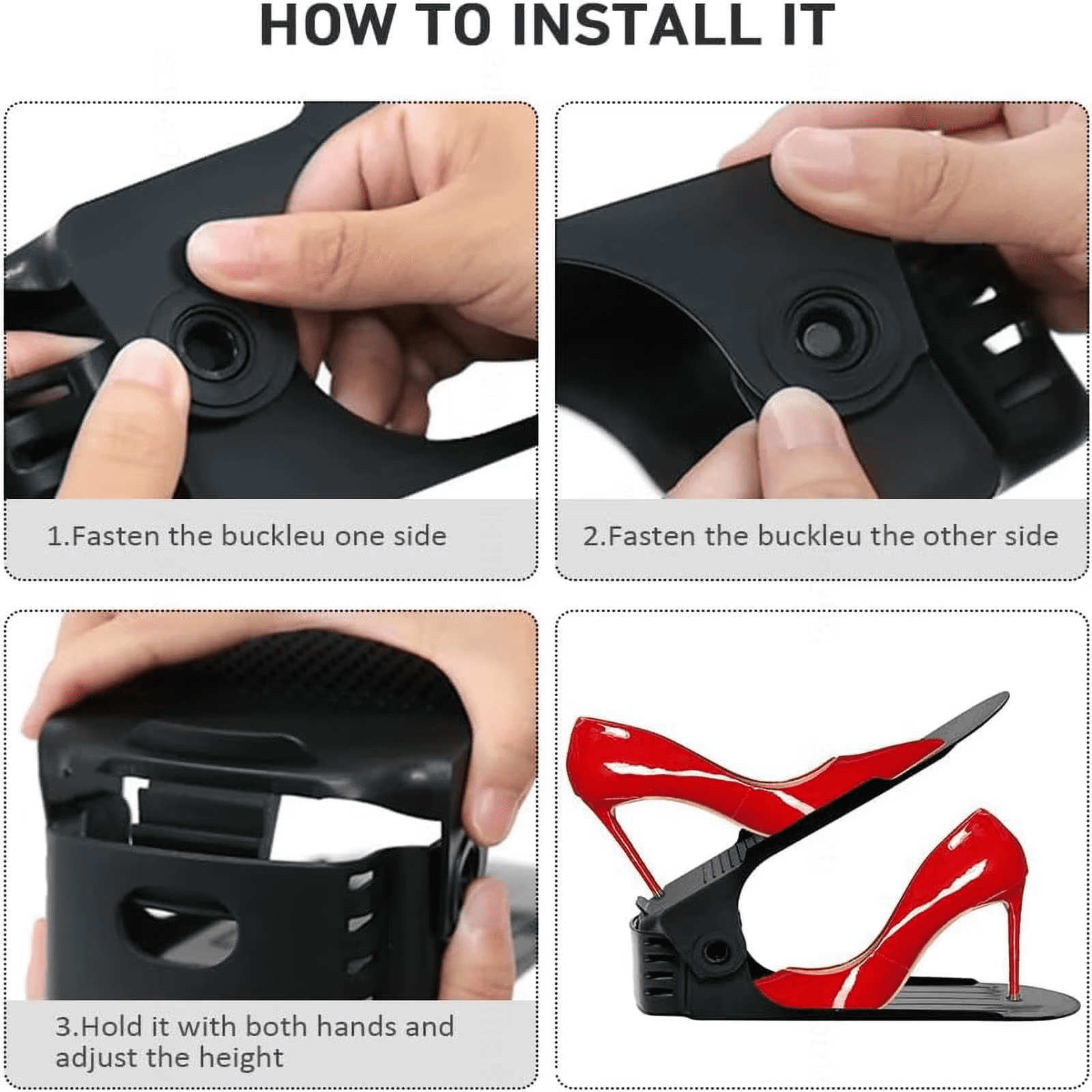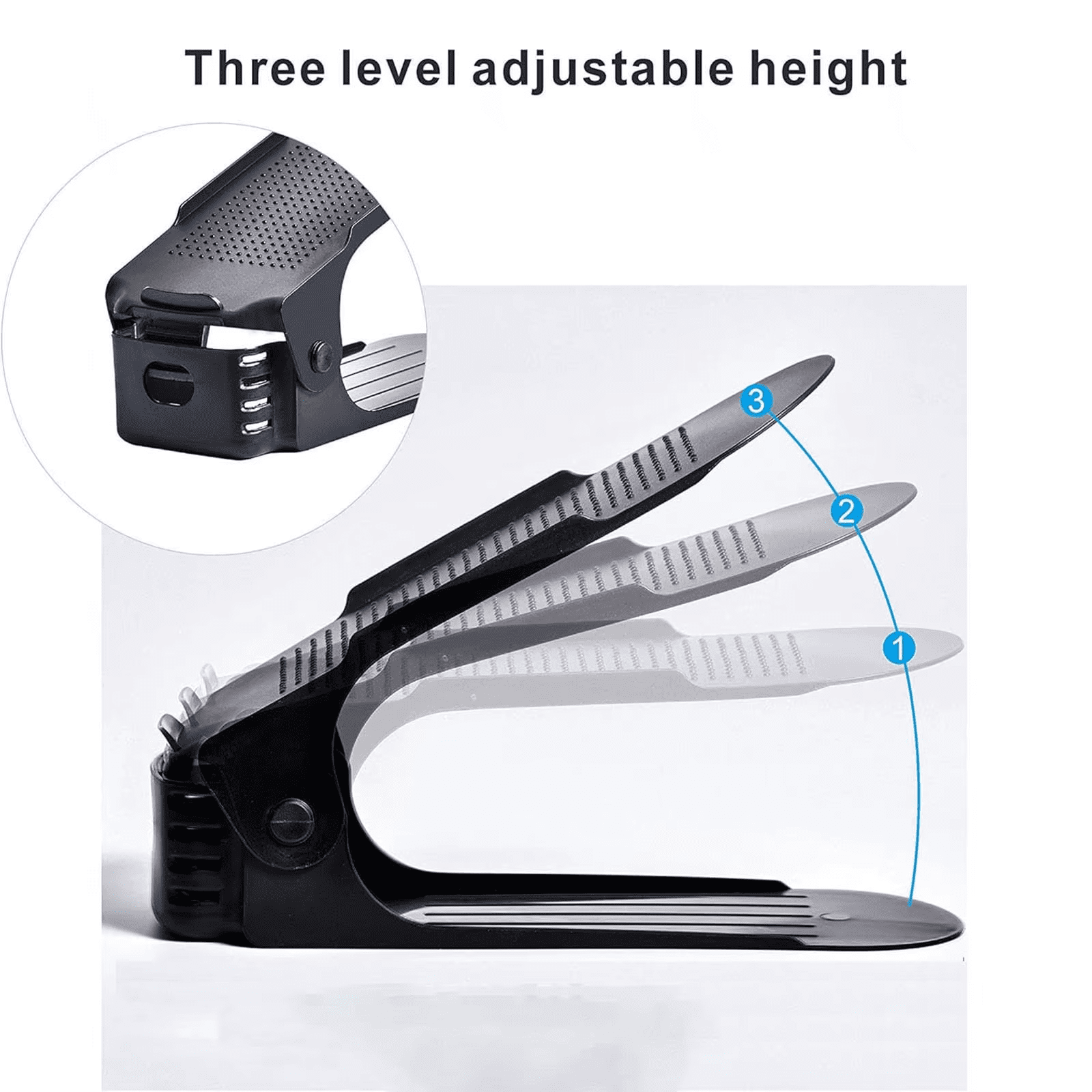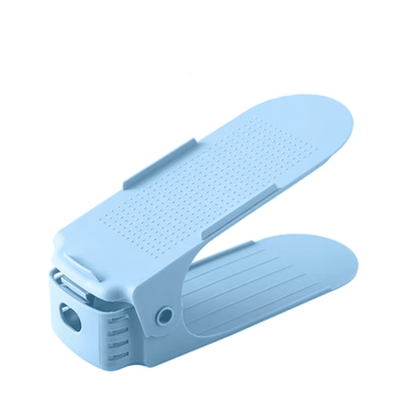 Double-deck shoe organizer with 4 adjustable height levels. Non-slip, space-saving, and perfect for all shoe types in closets and wardrobes.