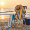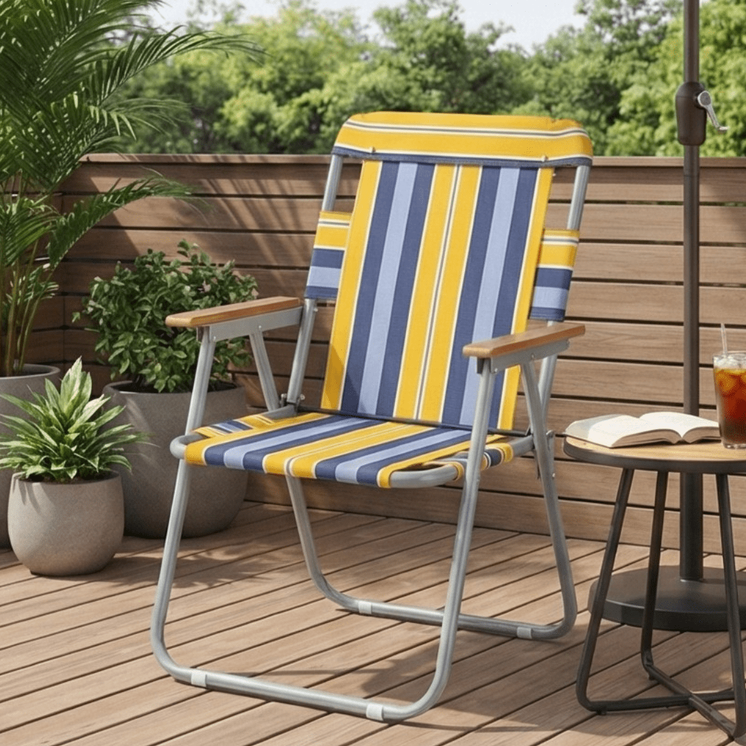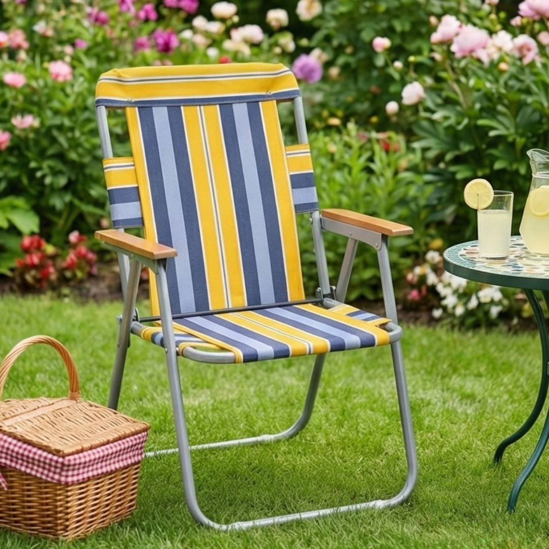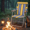 Finding your spot on a crowded beach can be difficult with dull gear. However, this chair features a bold Blue and Yellow design that is easy to spot from a distance. The contrasting colors are cheerful and summery. Therefore, it is perfect for families who want to keep track of their seating area. It adds a splash of fun personality to your camping setup.